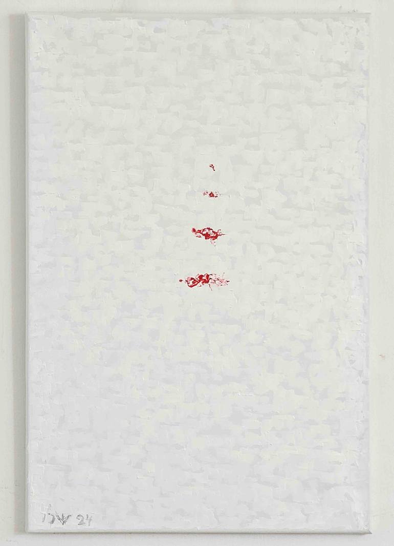 This artwork, rendered in oil on canvas, explores the depth of human emotions through a minimalist semi-abstract form. The sparse red markings against the expansive white represent moments of intensity in a life otherwise dominated by calm. It symbolizes the fleeting, yet impactful, interactions or ...