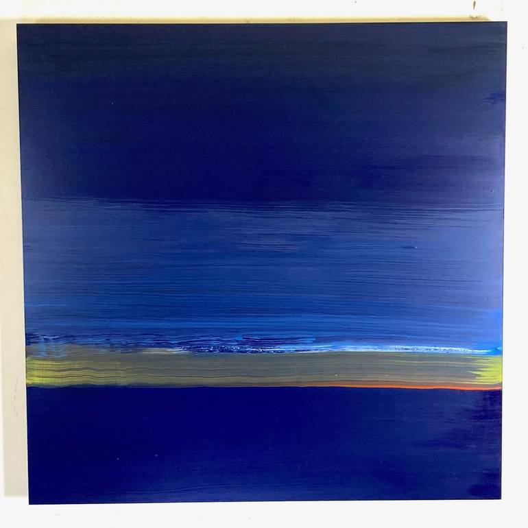 a calm sea crafted from a single stroke of a loaded brush that was almost discarded. Something told me this was the thing to do at that moment. Very glad I didn't hesitate. Enjoy! minimalist oil painting over enamel on gesso board. ships wire, ready to hang.