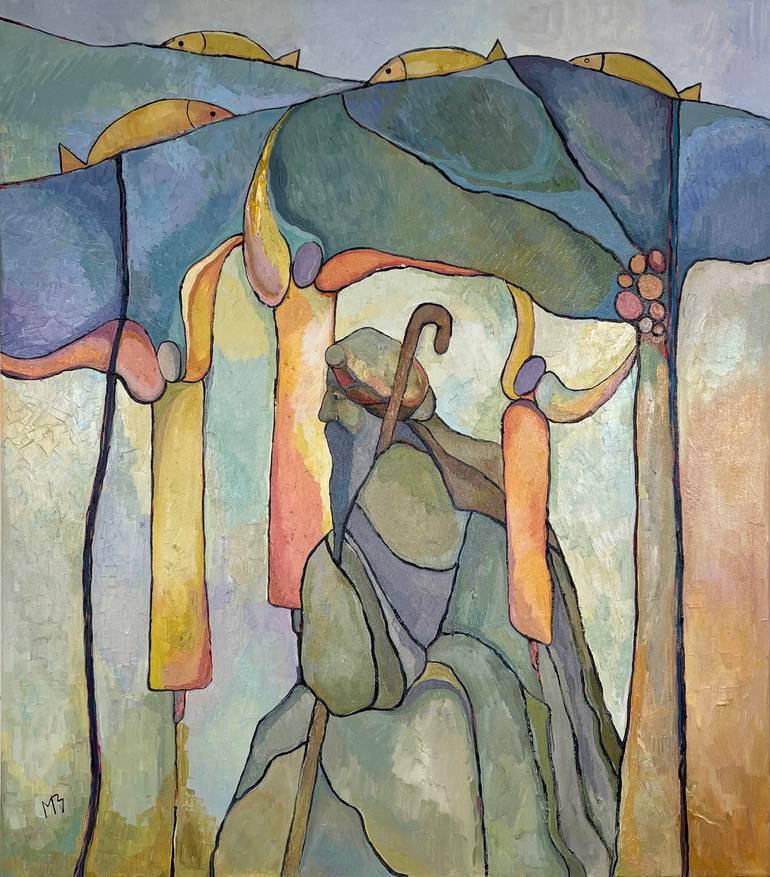 This painting is my reflection on the biblical story in which Abraham welcomes three travelers under the oak of Mamre, unaware that they are angels. I sought to convey not only the act of hospitality but also the mystical depth of this event. The figures of the guests seem to merge with the landsca...