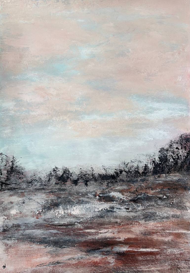Absolute Calm by Carrie Welsh is a beautifully textured abstract landscape painting. 59.4 x 42 cm (A2 size). Acrylic on paper. Frame not included. Requires framing.