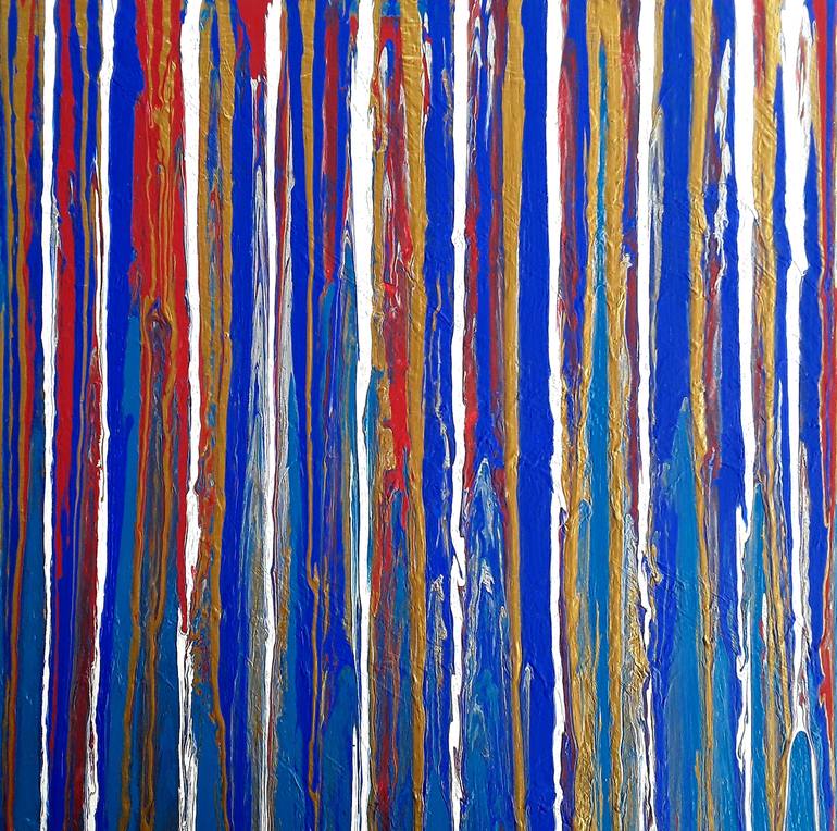 Acrylic on high quality professional grade splined canvas. Painting is ready to hang in your home. This modern art Drip Painting is richly painted in a pop art abstract style. A great modern art painting done in rich blue, red, and gold colors. A true gem which is ready to grace any home or fine ar...