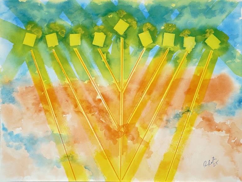 Abstract Chanukah Menorah on Fluid Background is a watercolor painting filled with vibrant colors of blue, orange, and yellow. The menorah rests calmly against a background of floating clouds. Abstract Chanukah Menorah on Fluid Background comes affixed to an acid free white mat for your convenienc...