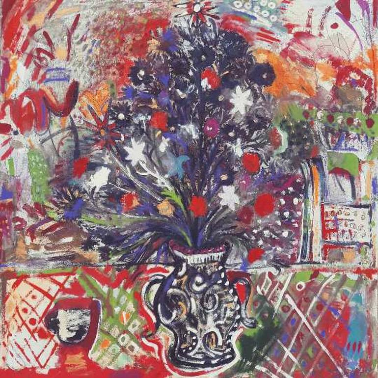 Flores abstractas con una demostración técnica asombrosa, donde se superponen colores aparentando el uso de un spray, pero es simplemente pintura. Un hermoso cuadro para decorar una sala principal.