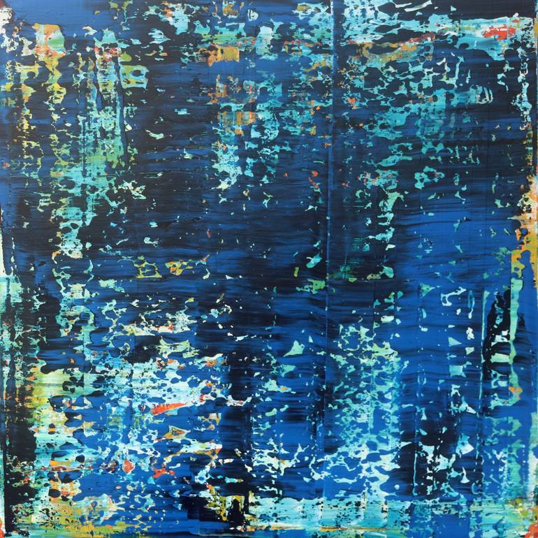 "Abstract N°2892" is a mesmerizing exploration of depth and color interplay. The composition is dominated by rich, dark blues that seem to shift and pulse over an underlying spectrum of green, orange, and light blue. These hidden layers subtly emerge, creating a dynamic tension between opacity and l...