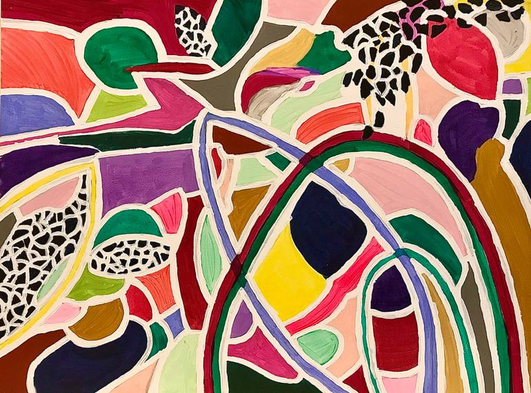 I make paintings using a range of media that explore colour, movement and structure and are inspired by my experiences growing up. Particularly significant memories are the vibrant markets of east Africa compared to the calm simplicity of Delft blue painting on ceramics. I am inspired by form, colour, texture, symbolism and meaning. Drawing on the legacy of Sonia Delaunay, I am interested in bringing together the traditions of Fine Art practice and craft-based Textiles. I am inspired by the way she places and arranges complex patterns of paint to explore variations in light, movement, and reflective colour. Her piece Electric Prisms had a big impact on me. In my most recent work, my primary interest is in natural forms, for example flower petals, tree roots and leaves. Like Delaunay, I am interested in the geometry of forms and I have been experimenting with creating my own abstract and geometric forms. I explore a more physical dimension to pattern and form by combining my paintings with other materials including fabrics, coloured wire and paper so that colour and form actually leap from the wall almost creating a feeling of wrapping around the viewer. It is important to me that my research and inspiration reflect who I am and that by merging these concepts I might be able to discover more about myself.