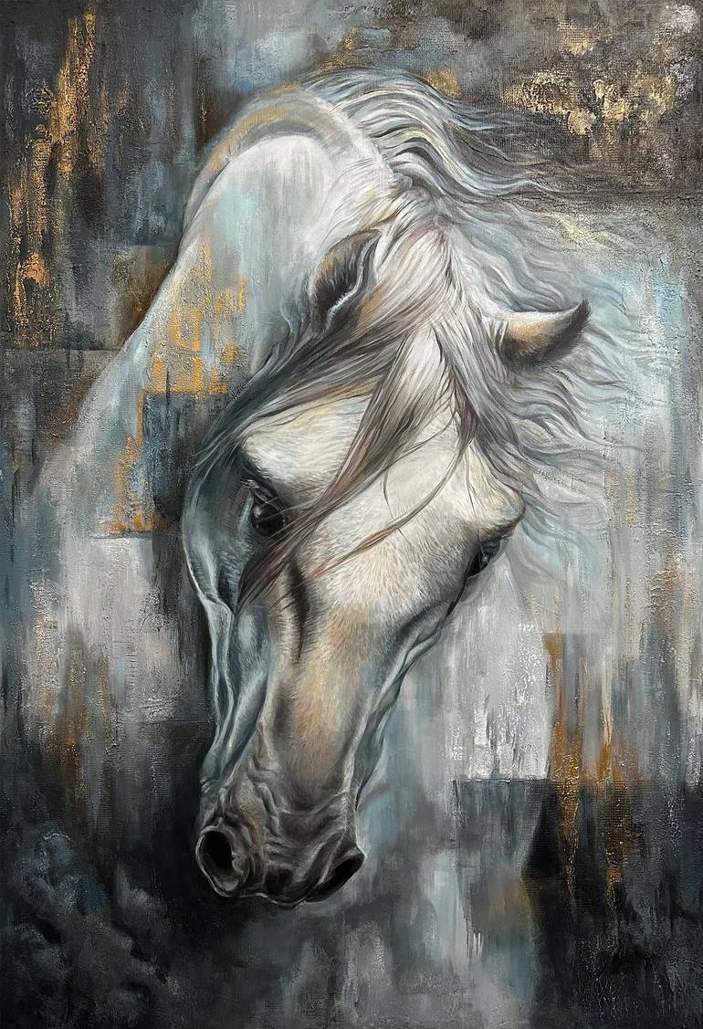 This painting was born from the desire to capture the power and grace of the horse, its strength and hidden vulnerability. I chose the technique of acrylic to fully express the richness and depth of color, and I used texture paste to create a layered abstract background that not only complements the...