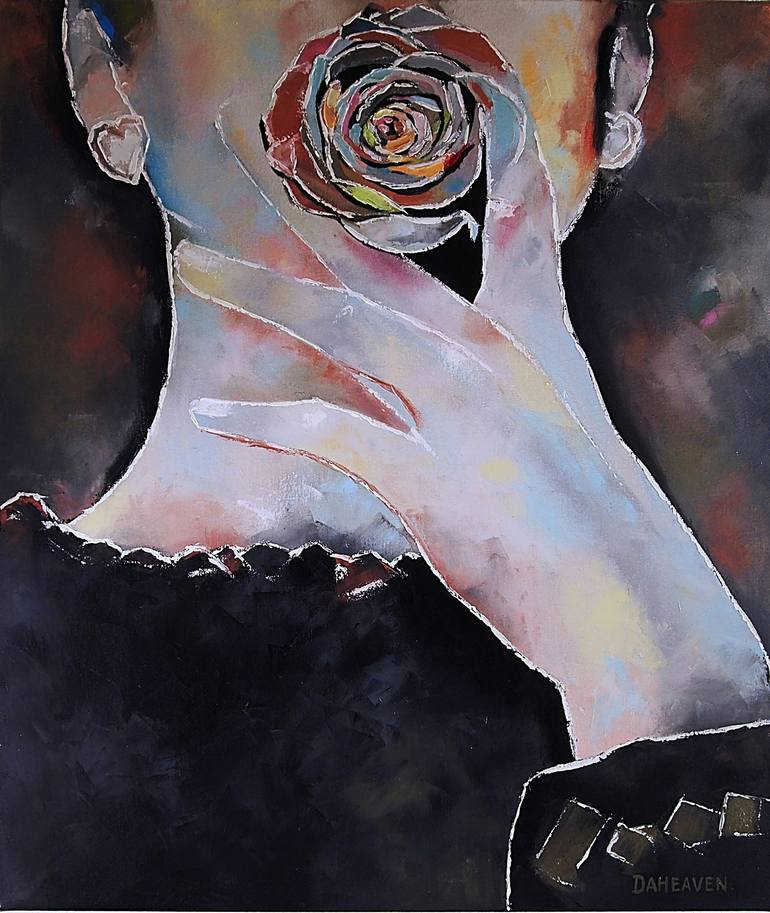 Abstract Portrait of Woman with Rose - Palette Knife Oil Painting. 60X70cm, oil on canvas. Immerse yourself in the enchantment of this captivating abstract portrait where the mystery and emotion of a woman holding a rose in her mouth come to life through the dynamic brushstrokes of a palette knife. ...