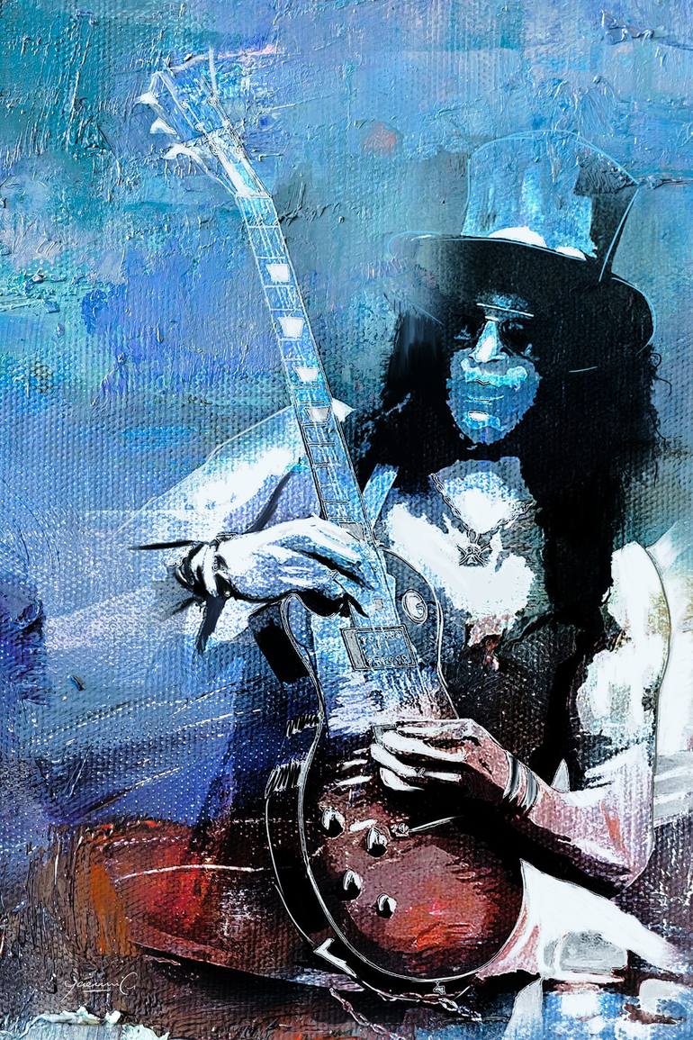 A vibrant and textured abstract painting of a guitarist wearing a top hat, skillfully blending shades of blue, white, and earthy tones to create a dynamic and expressive composition.