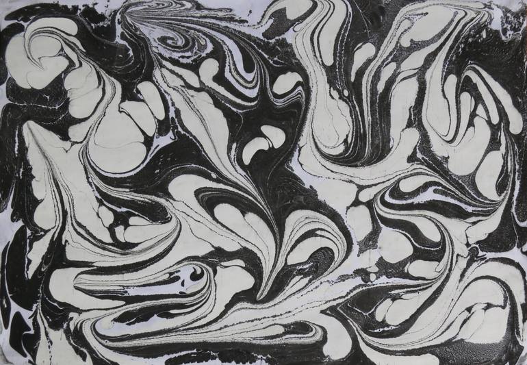 An abstract black & white ebru painting. In ebru painting the paint is first placed on the surface of the water and once the image is complete, the paper is placed on top of the paint and the paper is drawn off the water bringing the painting with it.
