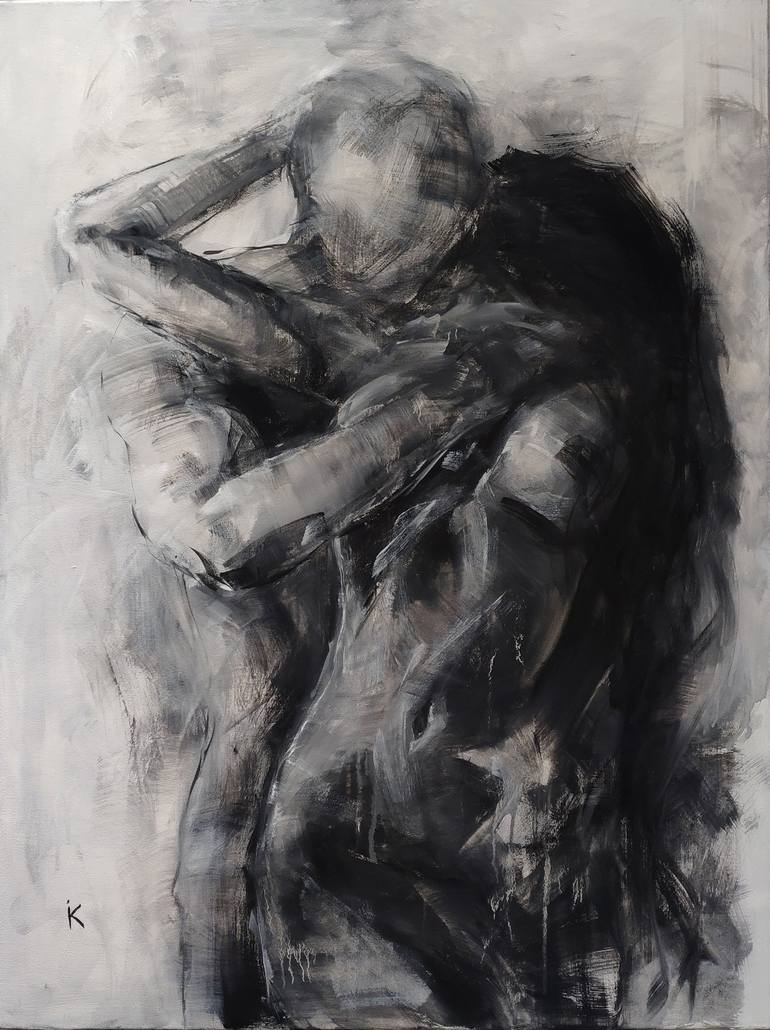 Description: This painting captures the raw essence of human connection and vulnerability. Created with bold, expressive strokes in monochromatic tones of black, gray, and white, it evokes a sense of intimacy and emotional depth. The abstract representation of intertwined figures invites the viewer ...
