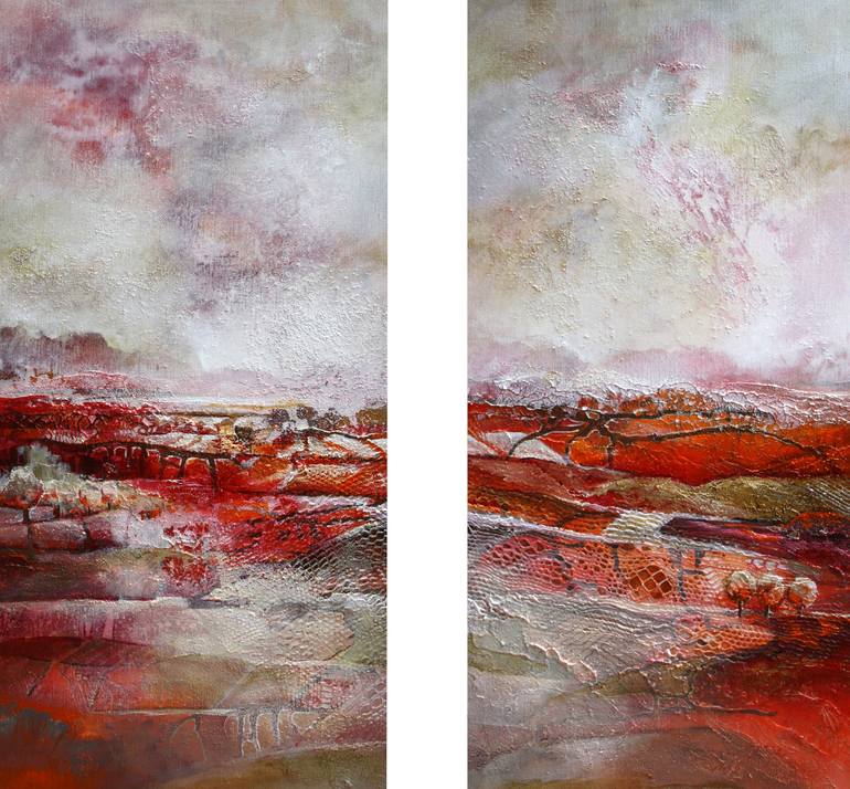 The painting is a diptych. Both parts are 31,49 x 15,74 inch. Between both parts a innerspace of 2 inches is needed. The wooden frame of the parts are strengthened with aluminium. The sides are painted aswel, so there is no need for a frame.