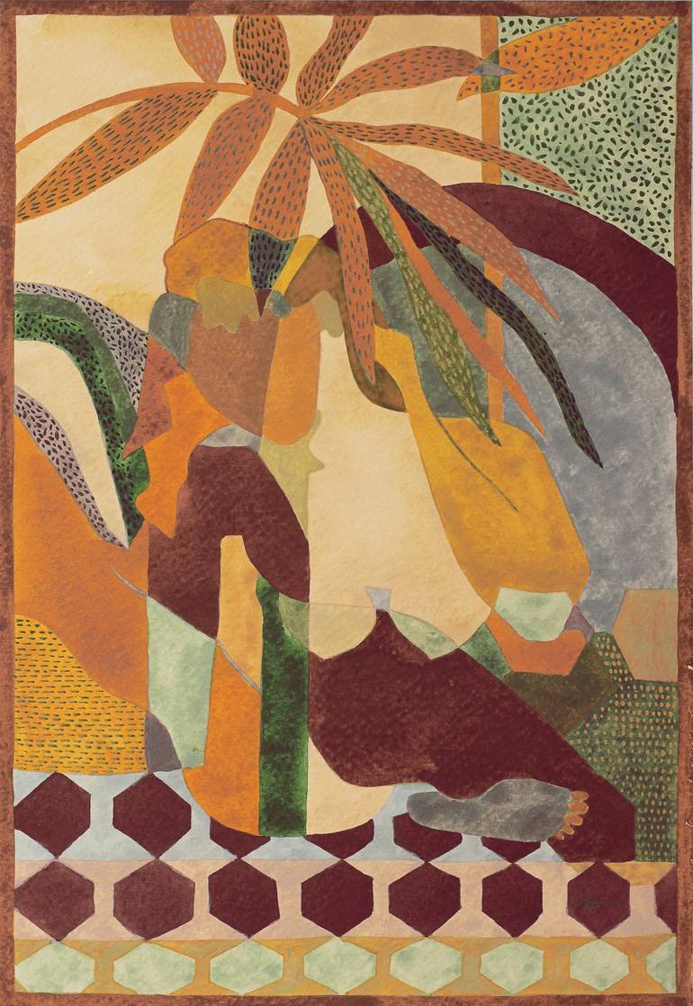 This work joins the artist's other works exploring color through layered abstract curves that outline and suggest intertwined nude bodies. The colors are warm, such as ochres and oranges, which dominate the scene. The painting presents a scene of tropical foliage, where geometric shapes overlap, evo...