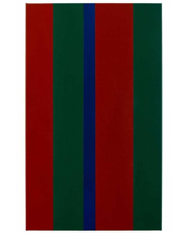 Currently in an exhibition at the Espacio 120 art space in Barcelona/Spain. This geometric striped colorfield painting is painted with red, green and blue highest quality pigments in a special watery thin acrylic dispersion. The reduced geometric minimalistc composition favors the perception of the...