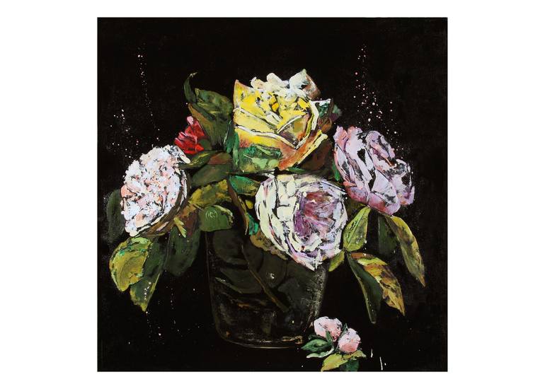 This was one of the first florals I did this past summer in appreciation of the profusion of flowers I saw everywhere around my neighborhood. Clearly this work is modeled after the Dutch masters of floral painting, although I doubt they would have appreciated the Jackson Pollack touches. Only pallet...