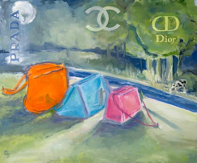 Pop expressionist oil painting that looks at luxury brands, hand bag accessories and pop culture.