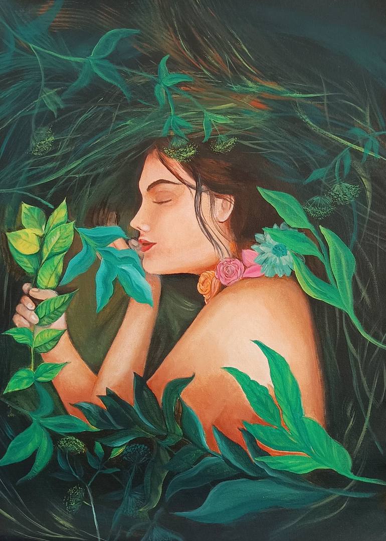 'Adapt to the Rhythm of Nature" portrays a woman sleeping peacefully in a lush forest, symbolizing harmony with nature. This realistic acrylic artwork reflects the belief that alignment with the natural world manifests dreams effortlessly. A serene piece inspiring balance and tranquility, perfect fo...