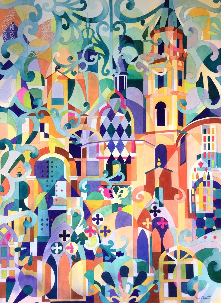 Working from her studio in the beautiful Peak District, Pam takes inspiration from the natural and built environment, painting flowers, landscapes and architecture in striking colours. Her intricate work, often graphic in style, combines elements of pattern and decoration with a vibrant colour palette. She is drawn to the details and decorative patterns found in beautiful historic buildings and enjoys the process of abstracting these elements to create complex overlapping designs in a kaleidoscope of colours. Pam graduated with a BA Hons in Graphic Design and with a travel bursary from the Royal Society of Arts she set out on a seven month journey of discovery around India where her love of colour and pattern was indulged and saturated. After a twenty four year career as a specialist art teacher, she now works full time as an artist, running courses for adults and art groups.