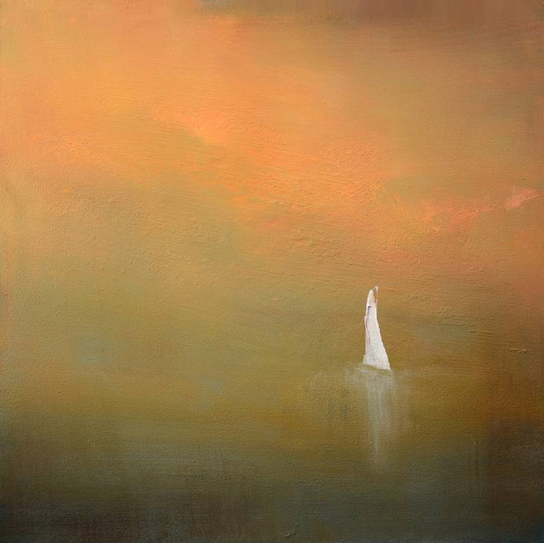 oil painting on panel Adrift by Maruice Sapiro depicts a small sailboat drifting alone in a dreamy scape where the water blends with the sky. This realist painting features a palette of warm coral and green tones. Award-winning artist Maurice Sapiro captures the beauty of Nature through his uniqu...