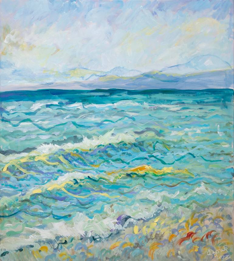 Nature makes huge impact on me and gives me an inspiration everyday. This piece is a memory from my trip to Greece. I was mesmerized by the richness of shades of the local sea, how the sunlight refracts in the wave, changing its color. My aim was to present my impression more than a realistic image;...