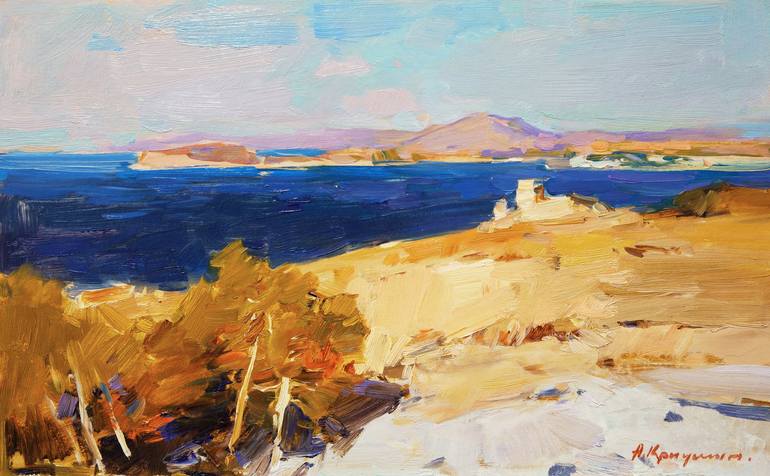 DESCRIPTION: Sketch for a large painting. The plot conveys the maritime space of the Greek coast of the Aegean Sea ARTIST: Aleksandr Kryushyn WORK: Original oil Painting, Handmade artwork, One of a Kind MEDIUM: Oil on Board YEAR: 2021 TITLE: "Aegean Sea" DIMENSIONS: 30 х 47 х 0.3 cm. / 11.8 x 18.5 ...