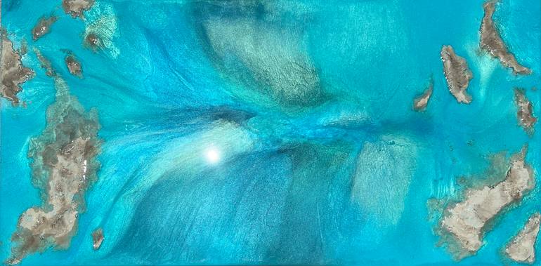 Original unique original seascape painting with white sandbars and beaches, inspired by The Australian Great Barrier Reef Different shades of blue, green, turquoise, teal, aqua, beige and white This painting does not need to be framed, the painted image is extended around all four sides, it is wire...