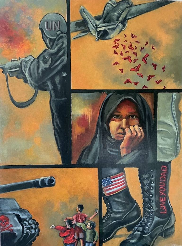 telling story about how war effects human soul. political painting. It is a collage painting showing the fear in the woman's eye and hopeless of future