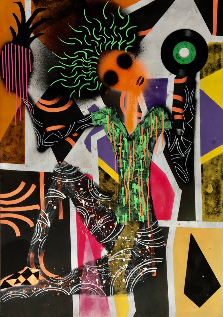 African figure influenced by contemporary art styles, by pop art, music and fashion expecialy by nike sneakers. I used gold spray paint for this african figure number 26. I was thrilled by the combination of black, gold and green colors which I combined with black staying figure holding LP disk. It ...