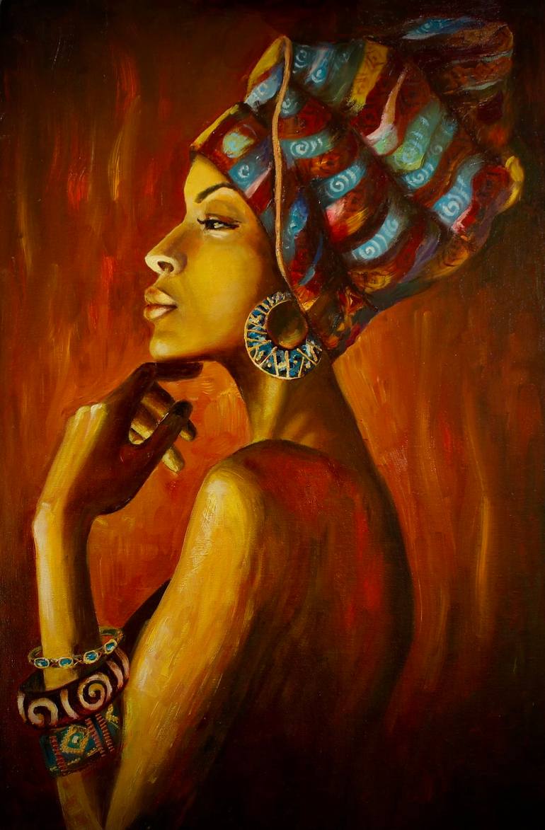 An artwork depicting a woman in African headwrap. Gold outline was used to illustrate the jewellery