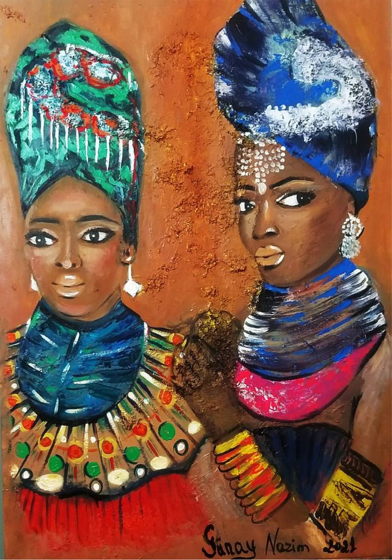 This painting is part of the Charming Ladies series. As part of the series, this work participated in the international festival "GOLDEN TIME TALENT ART" on 07.2022 and was awarded the 3rd place prize. African women always use a lot of jewelry. I have tried to depict their big eyes and decorations ...