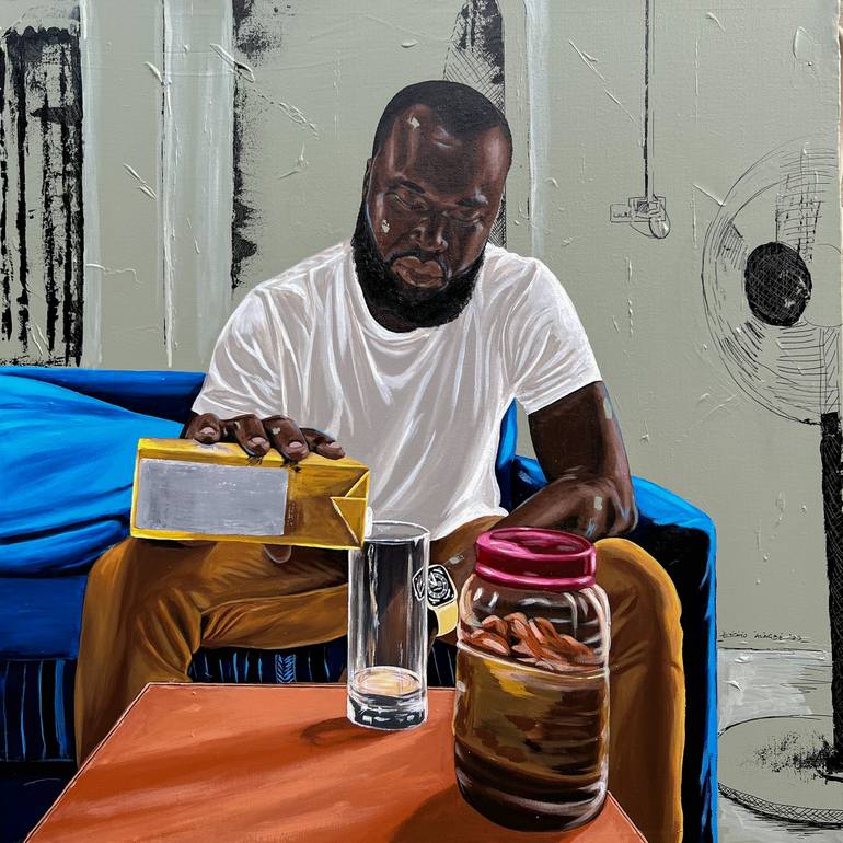 Eyitayo Alagbe (b. 1997) EYITAYO ALAGBE is a Nigerian multimedia visual artist based in Ibadan, Nigeria. He was born and raised in Ogbomoso, Oyo State, where he developed his artistic abilities from an early age. He honed his skills through a combination of natural talent, formal education, and practical experience. He holds an NCE certificate in Fine and Applied Arts from Emmanuel Alayande College of Education, Oyo (2019) and a degree in Fine and Applied Arts from Obafemi Awolowo University(2023). Eyitayo’s artistic practice explores the complexities of human experience, delving into themes such as diverse lifestyles, emotions, struggles, and strengths. His work particularly focuses on men’s mental health, the beauty and resilience of African women, and the unwavering perseverance of Africans. Eyitayo’s artwork is a testament to his skill and creativity, and he continues to push the boundaries of his craft with every pieces he creates, encouraging audience to find their own place within the broader narrative of our world.