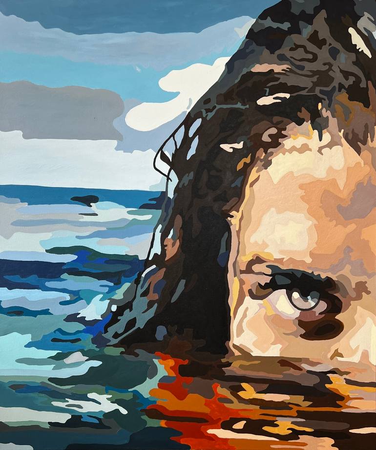 This acrylic painting features a dramatic composition in a stylized, abstract manner. The right side of the canvas prominently showcases the partial face of a woman emerging from the water, with her hair wet and flowing behind her. Her piercing, expressive eye is a focal point, adding intensity and ...