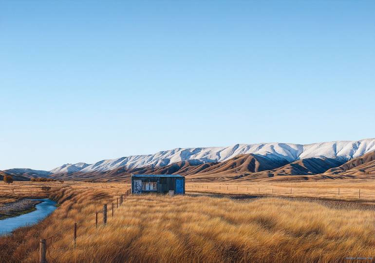 Afternoon Hush at the Hawkduns, features one of the little fisherman huts that are part of the old village that resides at Fall’s Dam in Central Otago. This painting was inspired by a poem by Brian Turner called Nor’Wester which describes the overbearing sun and the brisk wind moving the dry grasse...