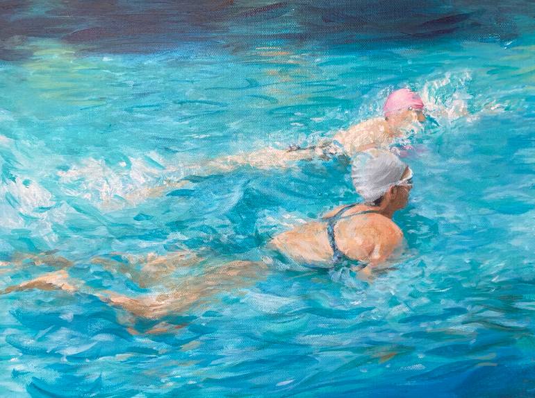 Sitting in the poolside café watching swimmers doing their lengths. It felt like these 2 were in a close race, each one edging ahead by a hat. There's a real sense of action as they splash up and down the pool.