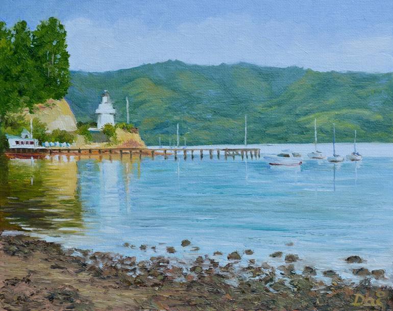 Akaroa Yacht Club beside the historic wooden lighthouse on Akaroa Harbour, Banks Peninsula, South Island, New Zealand. Oil painting by Dai Wynn on canvas panel. 20.3 cm high by 25.4 cm wide by 0.3 cm deep approximately. (8 inches by 10 inches).
