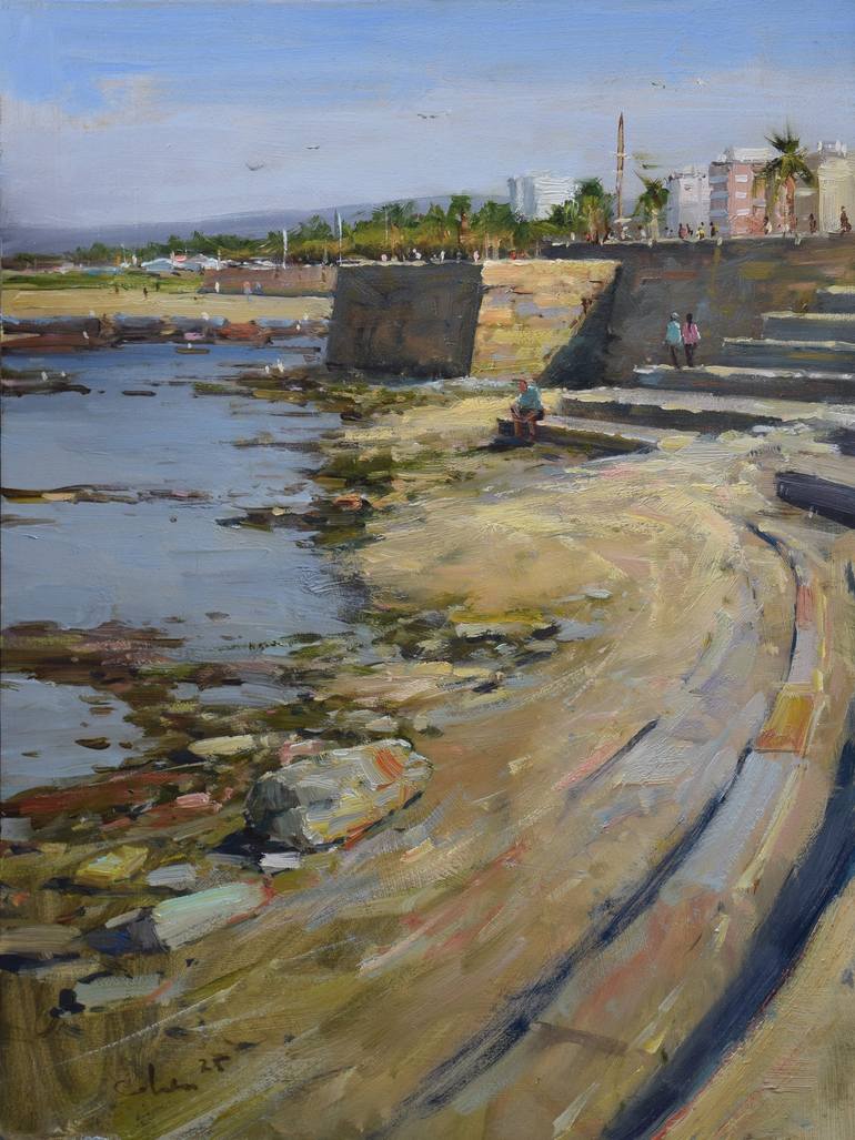 This plein air painting depicts a seascape with a coastline in the foreground, showing the rocky shore and a sandy beach. The painting features a curving path leading away from the shore towards a row of palm trees, buildings, and a tall tower in the distance. The water is calm and reflecting the bl...