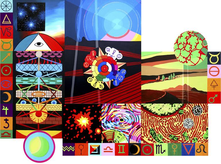 Merrill Steiger is a mid-career artist, living and working in Westport, CT. She has exhibited extensively in both solo and group exhibitions at museums, university galleries, art fairs, and galleries nationwide. Her work is in a number of public, private, and permanent collections. Cosmic Imaginarium, her newest series, is inspired by vintage science fiction pop-art. Steiger’s memories of childhood growing up in the 50s find themselves in the whimsical, yet mysterious expression of what lives in outer space. In this series, Steiger furthers her passion as a colorist, along with her continued interest in the use of dotting to evoke dynamic life force in space and beyond. In conjunction with textures and patterns, she turns flat, two-dimensional design into three-dimensional stories by shaping and layering multiple levels of mixed media. Typical for Steiger, her paintings reflect the extensive collage compositions that she begins each series and painting process with. Having an avid interest in science fiction, through movies and books, she explores this world through her own imaginary landscapes. Her combination of science fiction elements with pop-art imagery brings the unknown to life and reminds the viewer of life’s fantastical and fun nature. Super Nova, the newest of the series, is a dynamic statement of what Steiger imagines would happen in the cosmos during a supernova event. Her use of color enhances the piece’s main goal: balance of composition and design. Her inclusion of pop-art elements play homage to the fantastical nature of space and beyond while still revering the magnitude of cosmic space. In Spaceships, Steiger was inspired by vintage postage stamps to create a three-dimensional world of life in space. As is expressed throughout the series, she uses reversed imagery for balance, playing with how both mirroring and slight variation complement one another in overall aesthetic and tone. An extension of an earlier series, Sci-Fi, Cosmic Imaginarium is a continual nod to what lives beyond our human reality here on Earth. Its accessible and hopeful tone is an invitation to feel the interconnectedness of the universe while bringing imagination into reality.