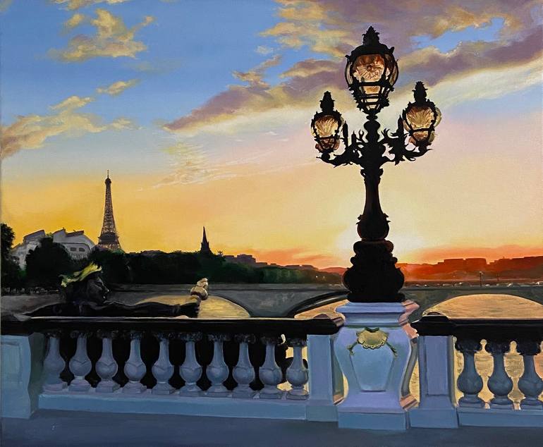 Paris Oil Painting Parisian landscape Sunset in Paris Alexander III bridge by Syncope Mars Title : Pont Alexandre III Size: 22x18" (55x46cm) Medium: professional oil paints, varnish applied for protection Material: stretched cotton canvas Style: Realism