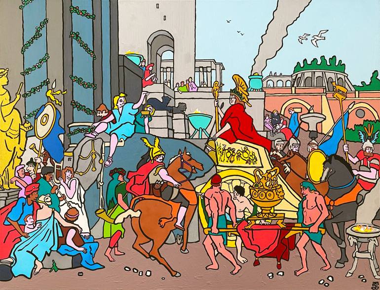 C'est une reprise de la toile baroque de Charles LeBrun de 1664 "Entrée d'Alexandre à Babylone" qui se trouve au Louvre, Paris. Il symbolise le retour glorieux d'Alexandre le grand après sa victoire contre le roi perse Darius 3 en 331 AVJC. Les chemins sont jonchés de fleurs et le char d'Alexandre e...