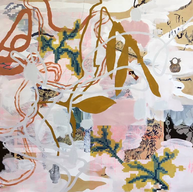 A hybrid of graphic, grid based images layered with gestural, flowing lines and floating ancient artefacts. The images in my work often refer to the way things are made; ceramics, needlework and tapestry patterns, yet hint at the digital world through the pixellation of imagery. The lines are like t...