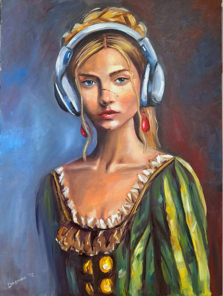 "Alice: A Fusion of Past and Present" is a captivating oil painting that seamlessly blends the elegance of the Renaissance with the vibrancy of modernity. At its core stands Alice, a vision of timeless beauty adorned in a Renaissance-era dress, her golden locks cascading around her shoulders and fra...