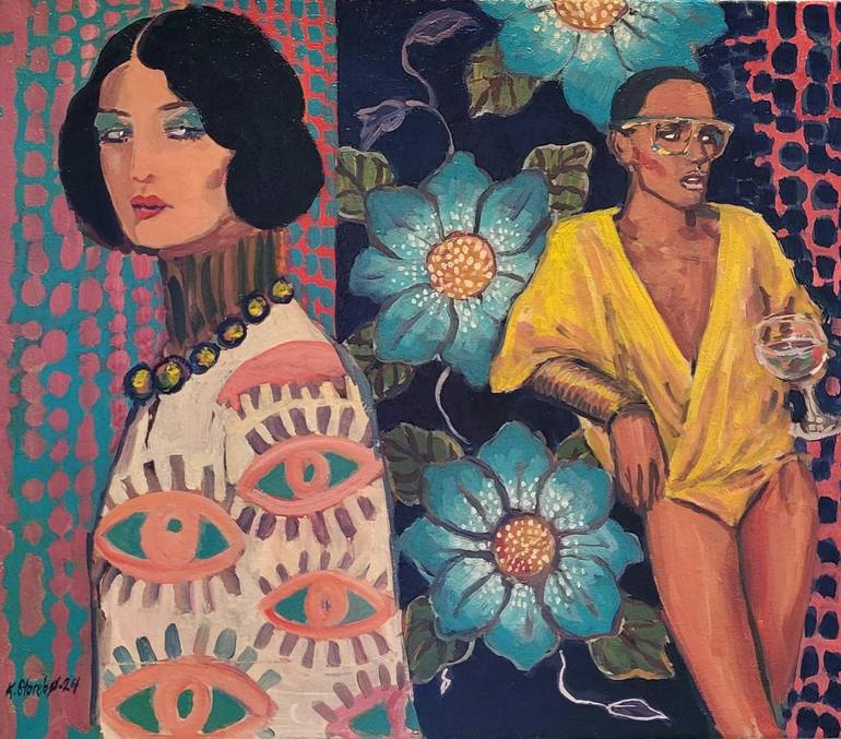 This painting is inspired by the glamour, beauty, and confidence of Myrna Loy and Grace Jones.