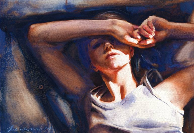 Basking in the soft, golden light of the sun, she shields her eyes, lost in a quiet moment of reflection. Her relaxed posture, bathed in deep, warm hues, suggests a serene escape from the rush of the world. The interplay of light and shadow delicately embraces her form, creating a scene that feels b...
