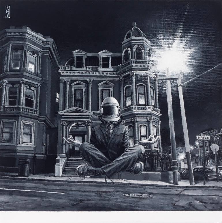 Alec Huxley (B. 1980) is a painter based in San Francisco, California. His work is representational, anchored by haunting cityscapes definitively of the American West Coast and the ghostly remnants of it's historic migration. Cinematic-like scenes serve as historical records of place, time and architectural style as well as the settings for surreal narratives. Well dressed figures in space helmets drift among Victorian buildings or rendezvous with wild animals in the empty streets of San Francisco. Other work references classical portraiture and still-life, with surreal combinations of nude astronauts perched atop solitary beasts, memento mori and anthropomorphic primates.