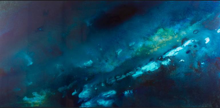 This resin painting depicts bioluminescence in the ocean as seen from above whilst flying over the tropical seas in the dark of the night. Bioluminescence is used by creatures in the ocean during specific lunar cycles. The inks and pigments shift with the changing of the light throughout the day....