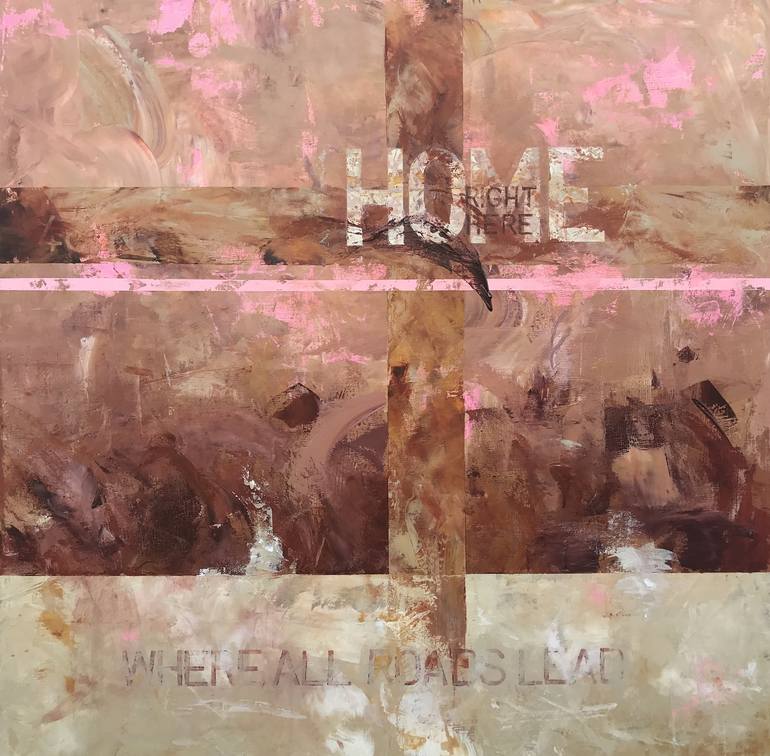 Having my family scattered across different countries has led me to write the message in this painting. All roads lead home, wherever home is! The painting represents a rectangular map where the parallel and meridian cross at 46 degrees North / 7 degrees East and the pink line shows the Equator.