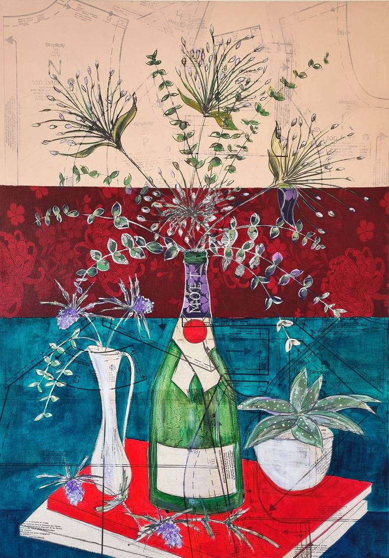 Alliums in Champagne is a still life original painting on canvas, tray framed in obeche wood Made with acrylic, gesso, graphite, pattern paper and Japanese kimono fabric on canvas. The flowers are eucalyptus and alliums in a moet bottle, the painting evokes a feeling of celebration as the flowers ...