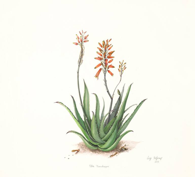 This botanical illustration of a "Aloe Rooikappie" were illustrated for the Kirstenbosch Botanical Art Biennale 2013. This watercolour illustration are painted on Archers 300g paper.