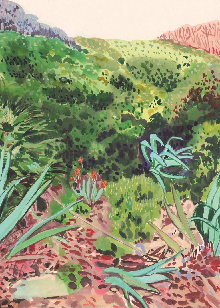 Inspired by the Mediterranean coast near Barcelona, this vibrant landscape captures the rich textures of cacti, rocks, and foliage. Painted in a bold, expressive style, the composition celebrates the wild, sunlit terrain. I chose gouache to bring out the lush greens and earthy tones, hoping viewers ...