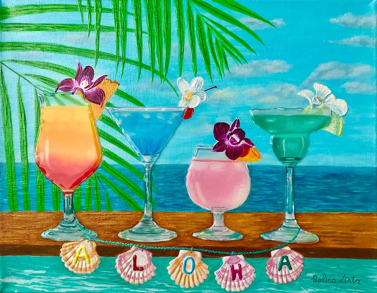 “Aloha” is an enchanting original painting that exudes the spirit of Hawaii’s warm hospitality and tropical delights. Four enticing glass tropical cocktails stand gracefully on a rustic wood board, each boasting a unique and vibrant hue. As you take in the scene, the swaying palm tree leaves above a...