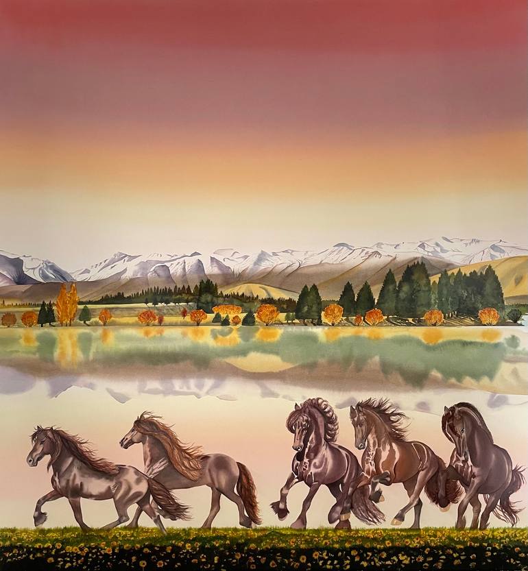 A huge and impressive painting. Rich colours shine through in this monumental watercolour. An autumn scene creates warm colours and the horses in the foreground are painted in with great detail. This is a painting that has been painted by a highly skilled proficient watercolourist. This painting...
